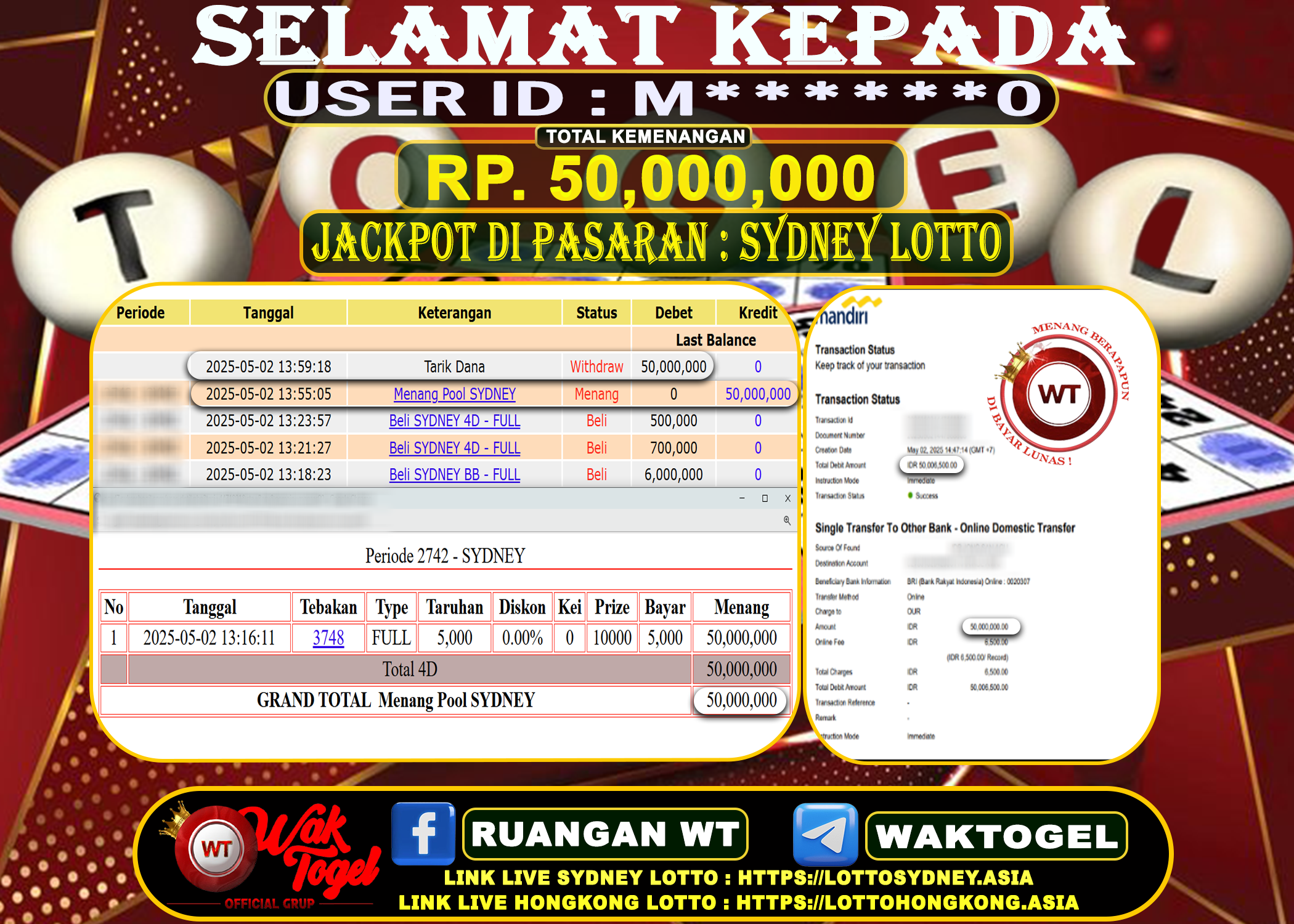 BUKTI PEMBAYARAN SYDNEY LOTTO WAKTOGEL RP. 50,000,000 – GAME : TOGEL SYDNEY LOTTO POOLS (USER ID : M******0) TANGGAL |02-05-2025| CASH LUNAS !