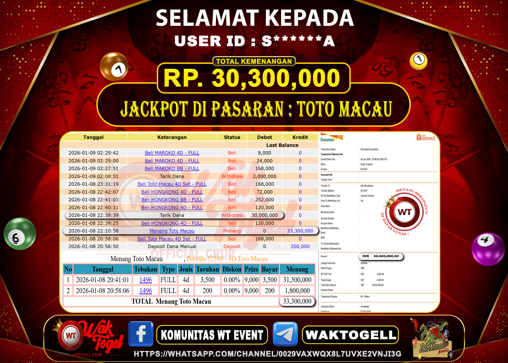 BUKTI PEMBAYARAN TOTO MACAU WAKTOGEL RP. 30,300,000 – GAME : TOGEL TOTO MACAU POOLS (USER ID : S******A) TANGGAL |09-01-2026| CASH LUNAS !
