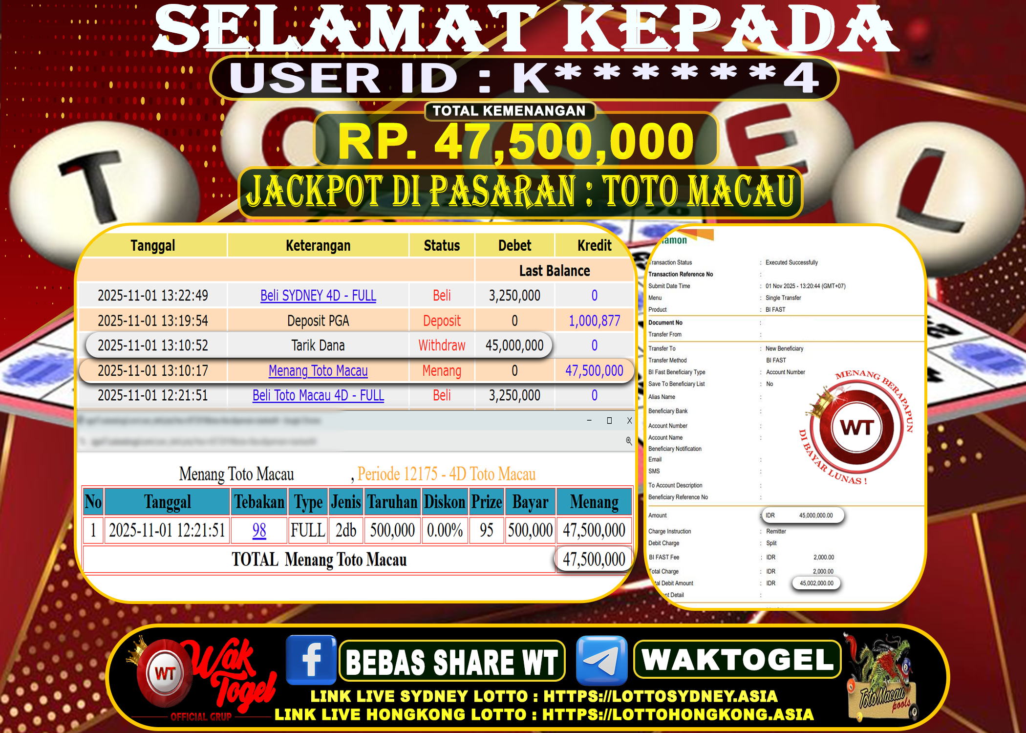 BUKTI PEMBAYARAN TOTO MACAU WAKTOGEL BUKTI PEMBAYARAN TOTO MACAU WAKTOGEL RP. 47,500,000 – GAME : TOGEL TOTO MACAU POOLS (USER ID : K******4) TANGGAL |01-11-2025| […]