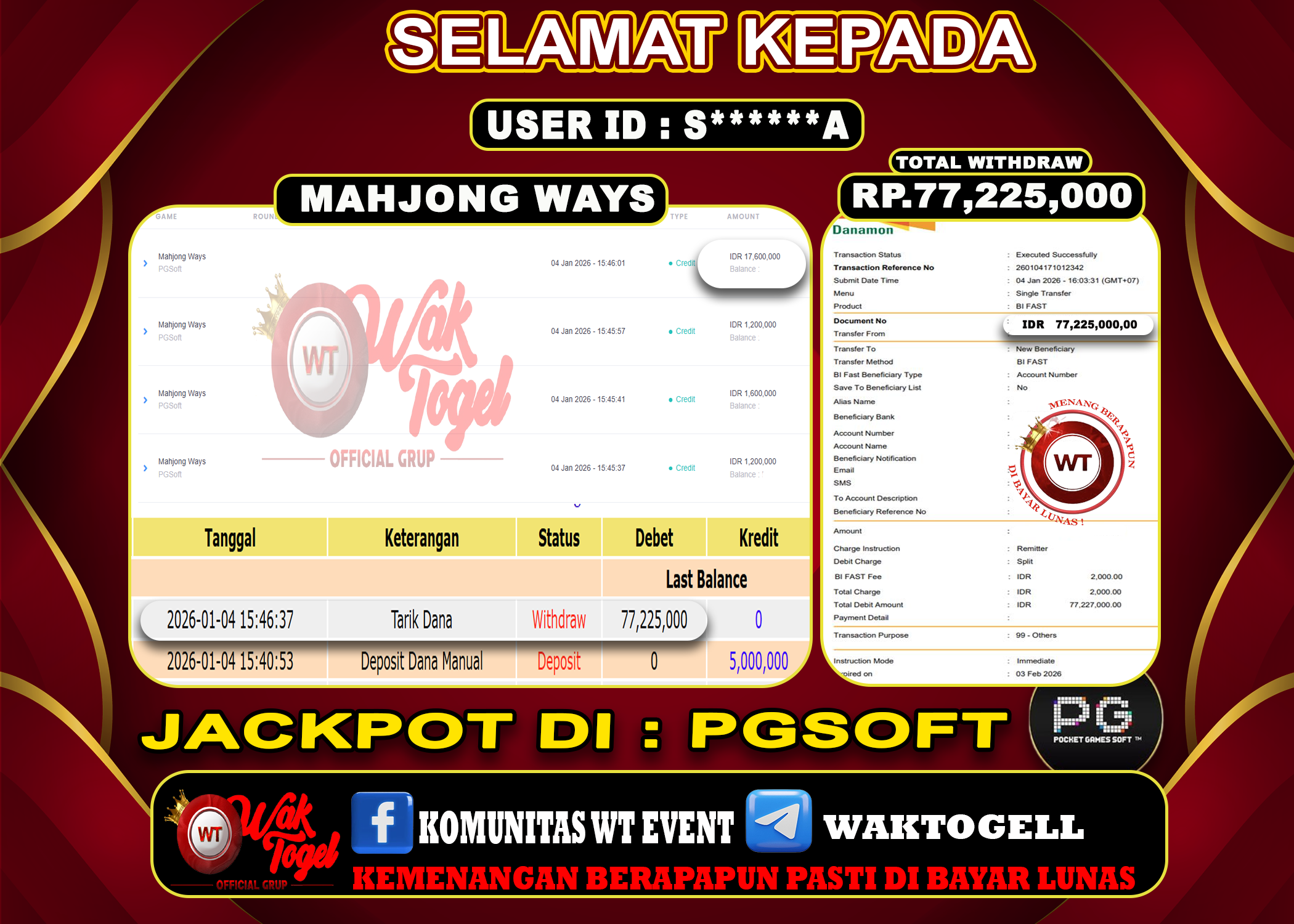 JACKPOT SLOT WAKTOGEL BUKTI PEMBAYARAN SLOT WAKTOGEL By JPWT Januari 4, 2026 0 comments 2 min read BUKTI PEMBAYARAN SLOT WAKTOGEL BUKTI PEMBAYARAN SLOT WAKTOGEL RP. 77,225,000 – GAME : SLOT MAHJONG WAYS (USER ID : S******A TANGGAL |04-01-2026| CASH LUNAS ! […]