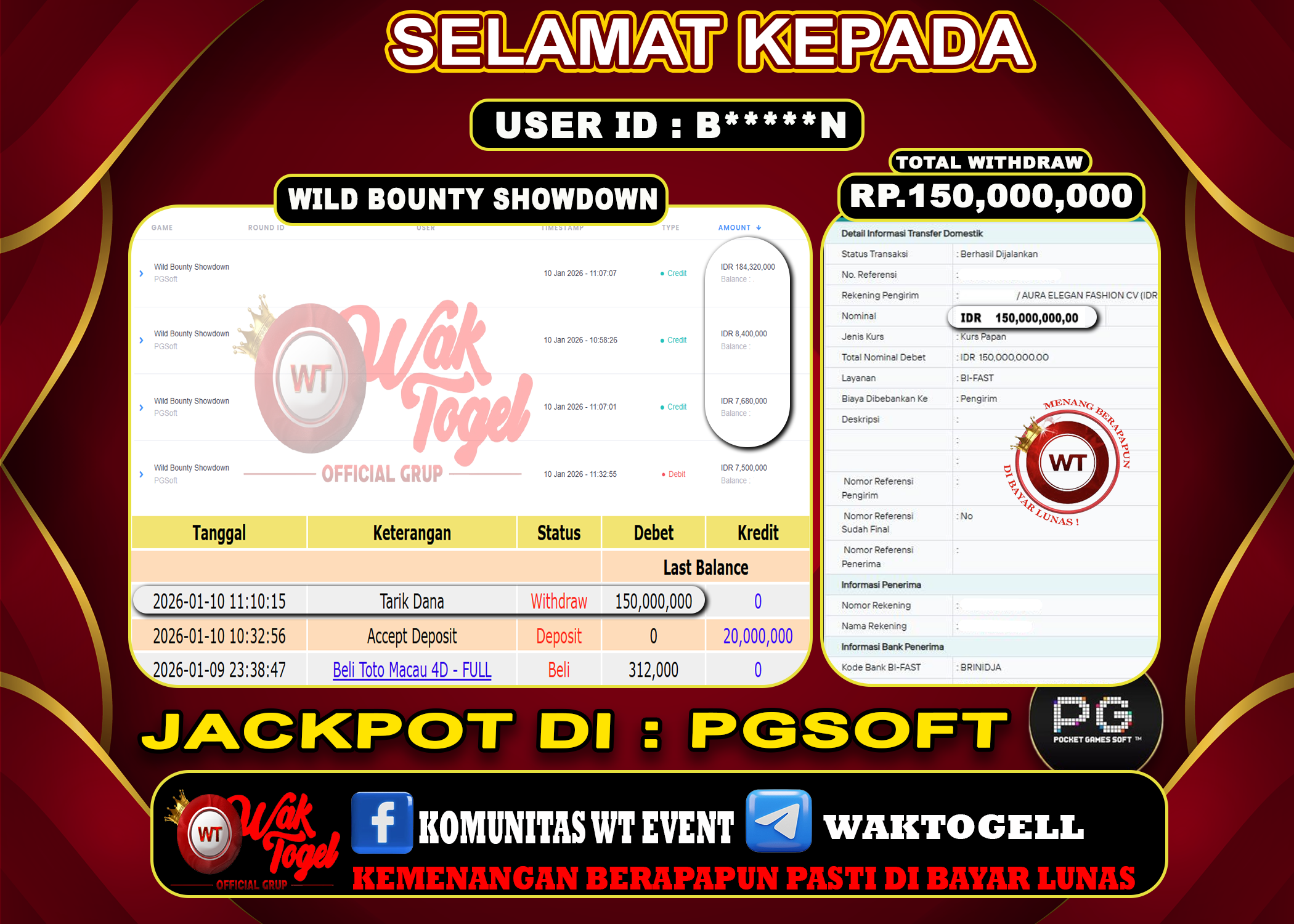 JACKPOT SLOT WAKTOGEL BUKTI PEMBAYARAN SLOT WAKTOGEL By JPWT Januari 10, 2026 0 comments 2 min read BUKTI PEMBAYARAN SLOT WAKTOGEL BUKTI PEMBAYARAN SLOT WAKTOGEL RP. 150,000,000 – GAME : SLOT MAHJONG WAYS (USER ID : B*****N TANGGAL |10-01-2026| CASH LUNAS ! […]