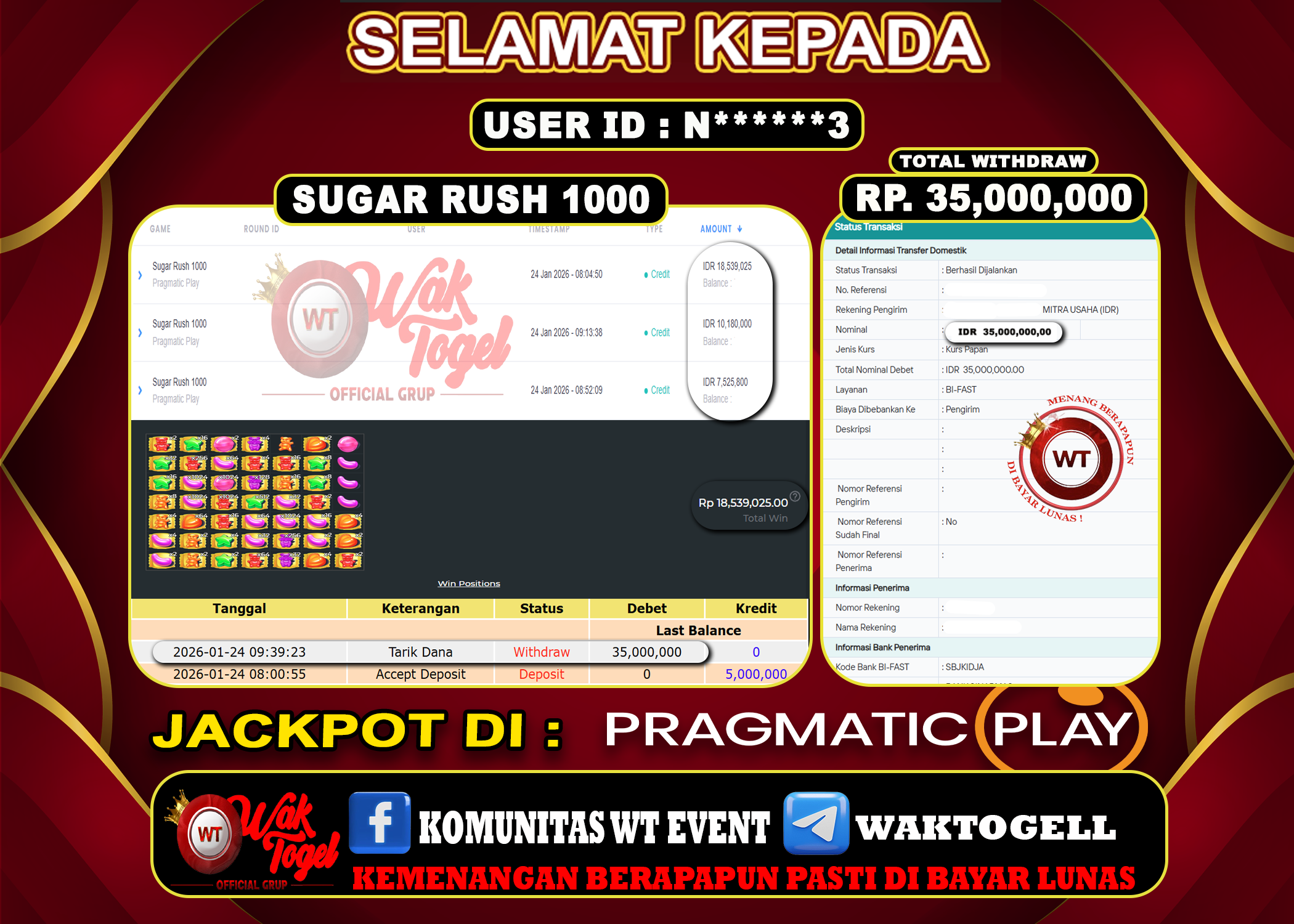 JACKPOT SLOT WAKTOGEL BUKTI PEMBAYARAN SLOT WAKTOGEL By JPWT Januari 24, 2026 0 comments 2 min read BUKTI PEMBAYARAN SLOT WAKTOGEL BUKTI PEMBAYARAN SLOT WAKTOGEL RP. 35,000,000 – GAME : SLOT SUGAR RUSH 1000 (USER ID : N******3) TANGGAL |24-01-2026| CASH LUNAS […]