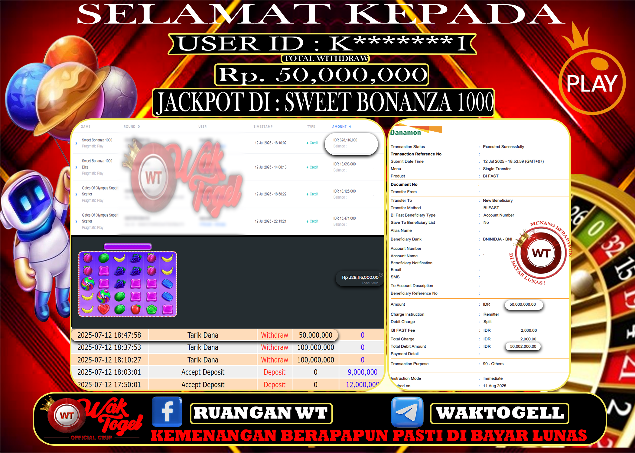 JACKPOT SLOT WAKTOGEL BUKTI PEMBAYARAN SLOT WAKTOGEL By JPWT Juli 13, 2025 0 comments 2 min read BUKTI PEMBAYARAN SLOT WAKTOGEL BUKTI PEMBAYARAN SLOT WAKTOGEL RP. 200,000,000 – GAME : SLOT SWEET BONANZA 1000 (USER ID : K*******1) TANGGAL |12-07-2025| CASH LUNAS […]