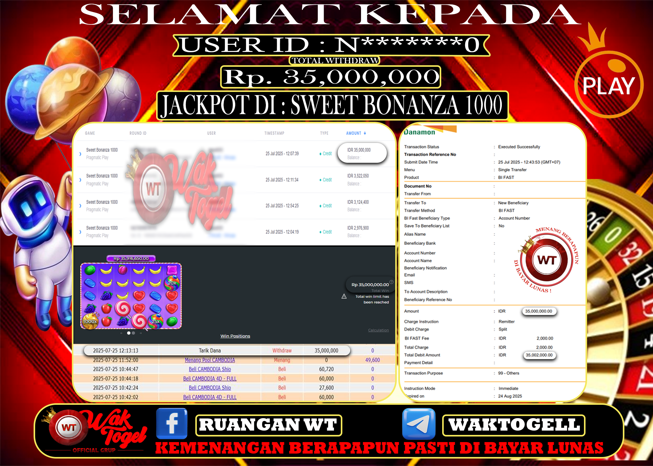 JACKPOT SLOT WAKTOGEL BUKTI PEMBAYARAN SLOT WAKTOGEL By JPWT Juli 25, 2025 0 comments 2 min read BUKTI PEMBAYARAN SLOT WAKTOGEL BUKTI PEMBAYARAN SLOT WAKTOGEL RP. 35,000,000 – GAME : SLOT SWEET BONANZA 1000 (USER ID : N*******0) TANGGAL |25-07-2025| CASH LUNAS […]