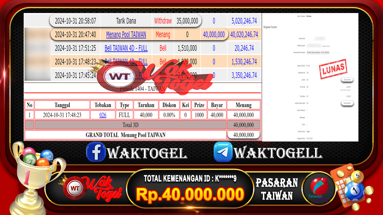 JACKPOT TOGEL WAKTOGEL BUKTI PEMBAYARAN TAIWAN WAKTOGEL By JPWT Oktober 31, 2024 0 comments 2 min read BUKTI PEMBAYARAN TAIWAN WAKTOGEL BUKTI PEMBAYARAN TAIWAN WAKTOGEL RP. 40.00.000 – GAME : TOGEL TAIWAN POOLS (USER ID : K*******9)TANGGAL|31-10-2024| CASH LUNAS ! Kami ucapkan […]