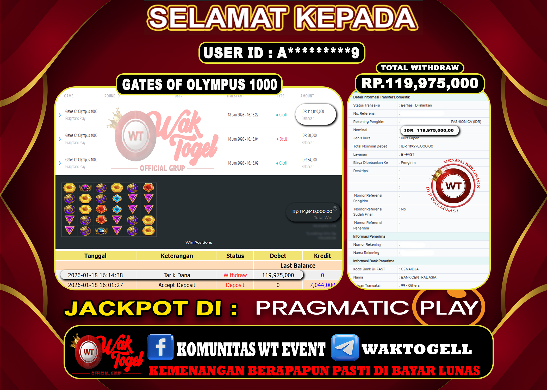 BUKTI PEMBAYARAN SLOT WAKTOGEL BUKTI PEMBAYARAN SLOT WAKTOGEL RP. 119,975,000 – GAME : SLOT GATES OF OLYMPUS 1000 (USER ID : A********9) TANGGAL |18-01-2026| CASH […]