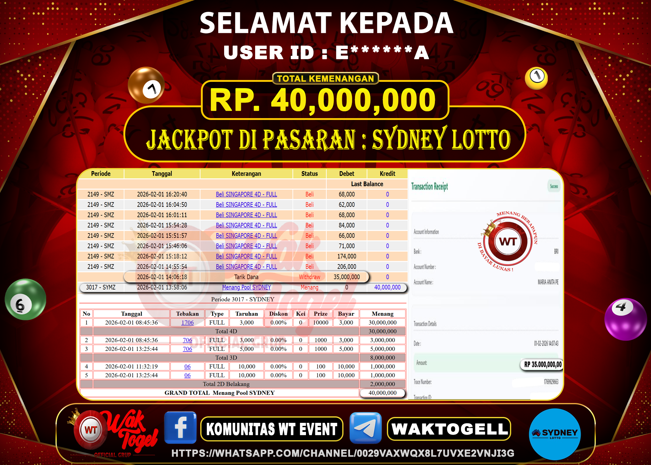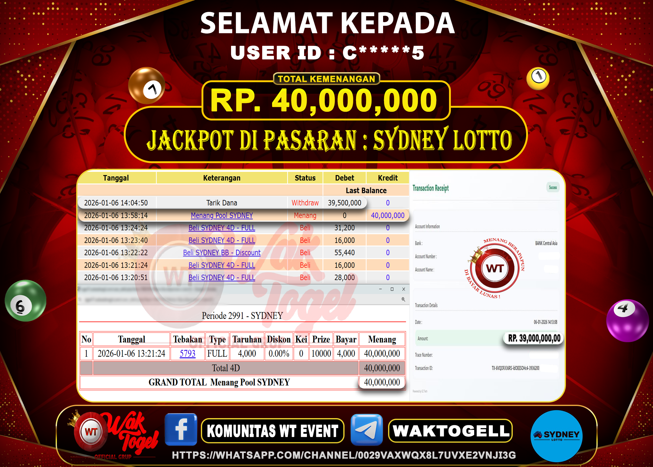 BUKTI PEMBAYARAN SYDNEY WAKTOGEL BUKTI PEMBAYARAN SYDNEY LOTTO WAKTOGEL RP. 40.000.000 – GAME : TOGEL SYDNEY LOTTO POOLS (USER ID : C*****5) TANGGAL |06-01-2026| CASH […]