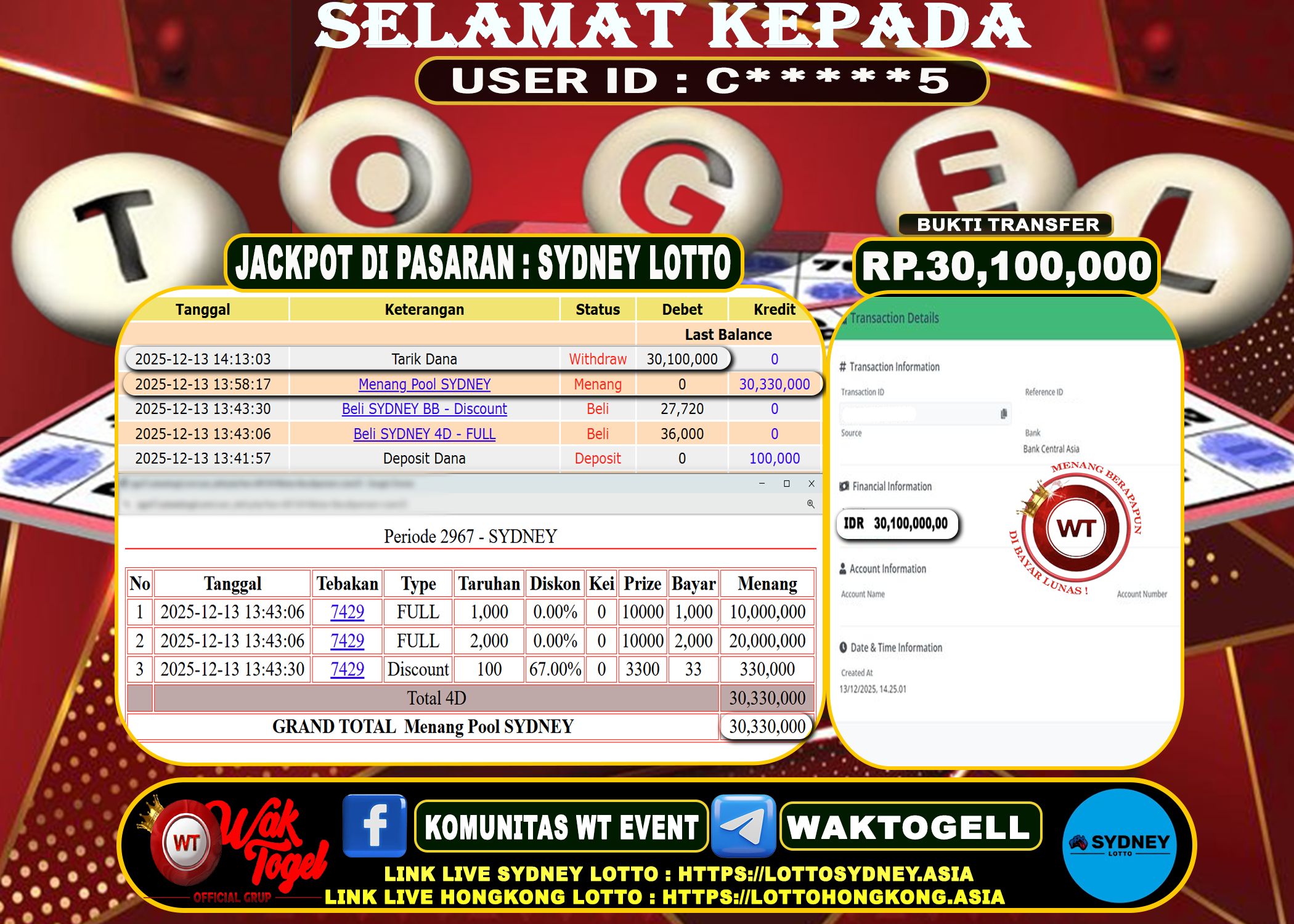 BUKTI PEMBAYARAN SYDNEY WAKTOGEL BUKTI PEMBAYARAN SYDNEY LOTTO WAKTOGEL RP. 30.100.000 – GAME : TOGEL SYDNEY LOTTO POOLS (USER ID : C*****5) TANGGAL |13-12-2025| CASH […]